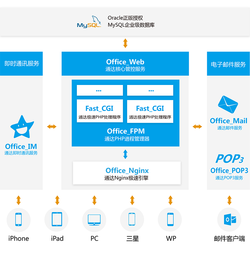 在2015版中,为彻底解决Apache服务稳定性不高以及对大并发情况支持效果欠佳的问题,在通达技术总监刘向前的亲自带领下,通达于新版本中大胆舍弃了沿用十多年的ApacheWeb服务,而专门采用了Fast_CGI通达极速PHP处理程序,并通过Office_Nginx通达极速引擎以及Office_FPM通达PHP进程管理器进行高效协同和管理,从而极大限度的提升了Web服务的效率和稳定性。