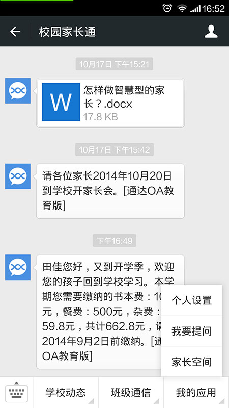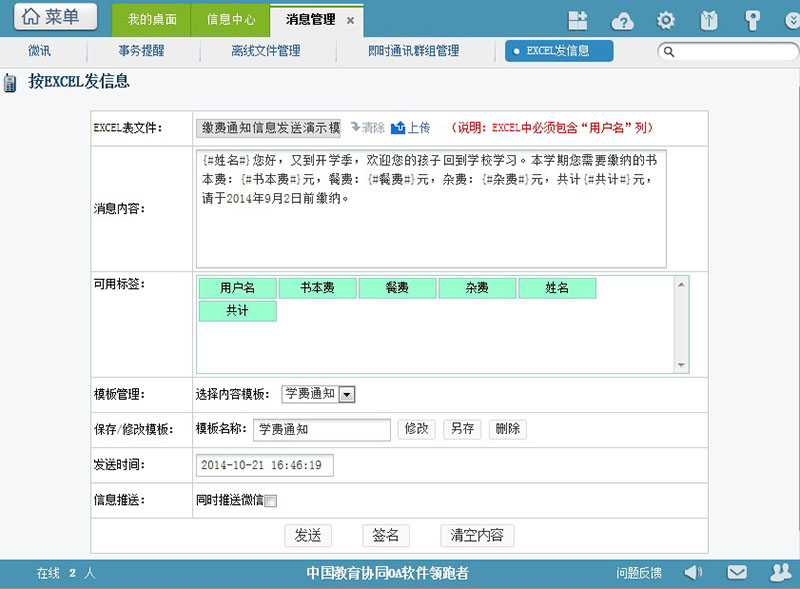 在教育版OA中发送消息,可以自动通过微信企业号群发给家长